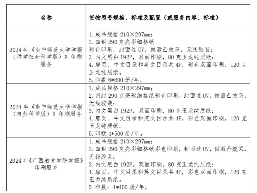 根据《广西壮族自治区财政厅关于进一步规范政府采购意向公开工作的通知》(桂财采〔2022〕84号)等有关规定,本次印刷业务采购面向自治区本级预算单位印刷服务定点采购供应商,现将南宁师范大学学报印刷服务采购意向公开如下: