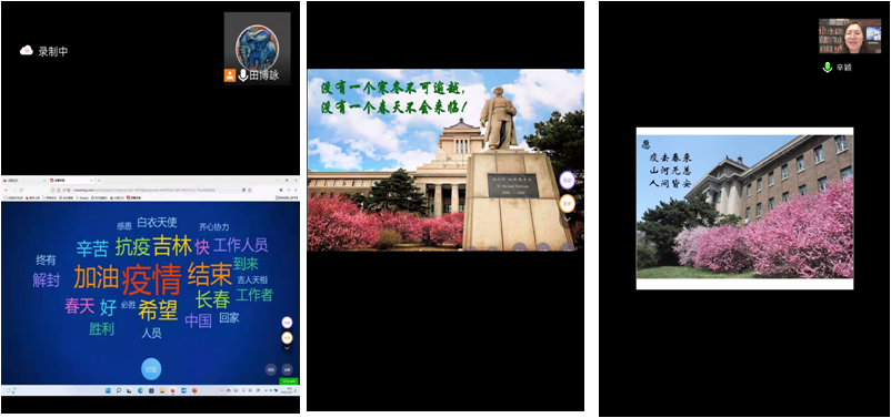 学院教师积极参与和组织课前5分钟的抗疫宣讲活动,利用上课刚开始的几分钟与学生们沟通思想、交流感情,积极弘扬了生命至上的伟大抗疫精神,帮助了学生树立抗疫必胜信心、适应在线课堂学习模式、保质保量完成学习任务。授课教师们的一张张图片,一个个小视频,为大家展示了医护工作者、志愿者们的辛苦付出,老师们与学生们在云端共同期待长春的春天早日到来。学院坚持把课前抗疫精神五分钟宣讲作为课程思政的重要环节,有效提升了课程思政的时效性,学院也将以此次活动为契机,精心打磨课程思政设计,进一步提高医学人才的培养质量。
