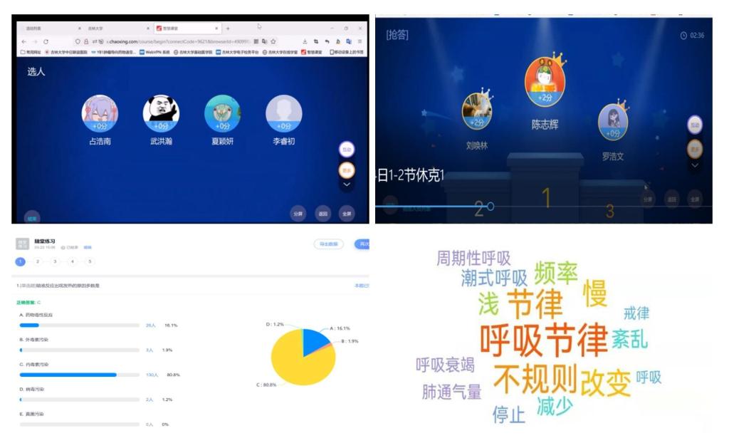 3. 人性化、信息化、高质量的教学实施过程:授课教师利用课前五分钟分别采用抗疫短视频、以及同学们自制的抗疫宣讲,鼓舞士气,坚定信心!吉林终有吉临日!长春定复往常春!教师们不但根据线上课程特征,精心设计了自己的课件和教学过程,采用多个短时间知识点教学、利用学习通穿插多种在线教学反馈的教学模式,可以不断凝聚学生的注意力,随时调整上课节奏,促进学生对知识的理解和吸收。通过学习通发布的签到及时掌握了学生出勤情况,在授课的过程中设置抢答、选人、主题讨论等环节,增加与学生的互动,并启发学生思考。通过学生微课堂激发兴趣提升学生综合能力,采用随堂测验了解学生对本次教学内容的理解掌握情况,及时进行答疑解惑,解决知识点漏洞。教师们还在课后布置课后作业与讨论,进行本次教学重点内容的巩固复习,并通过QQ群解答同学们的疑惑,稳步提高在线教学质量。