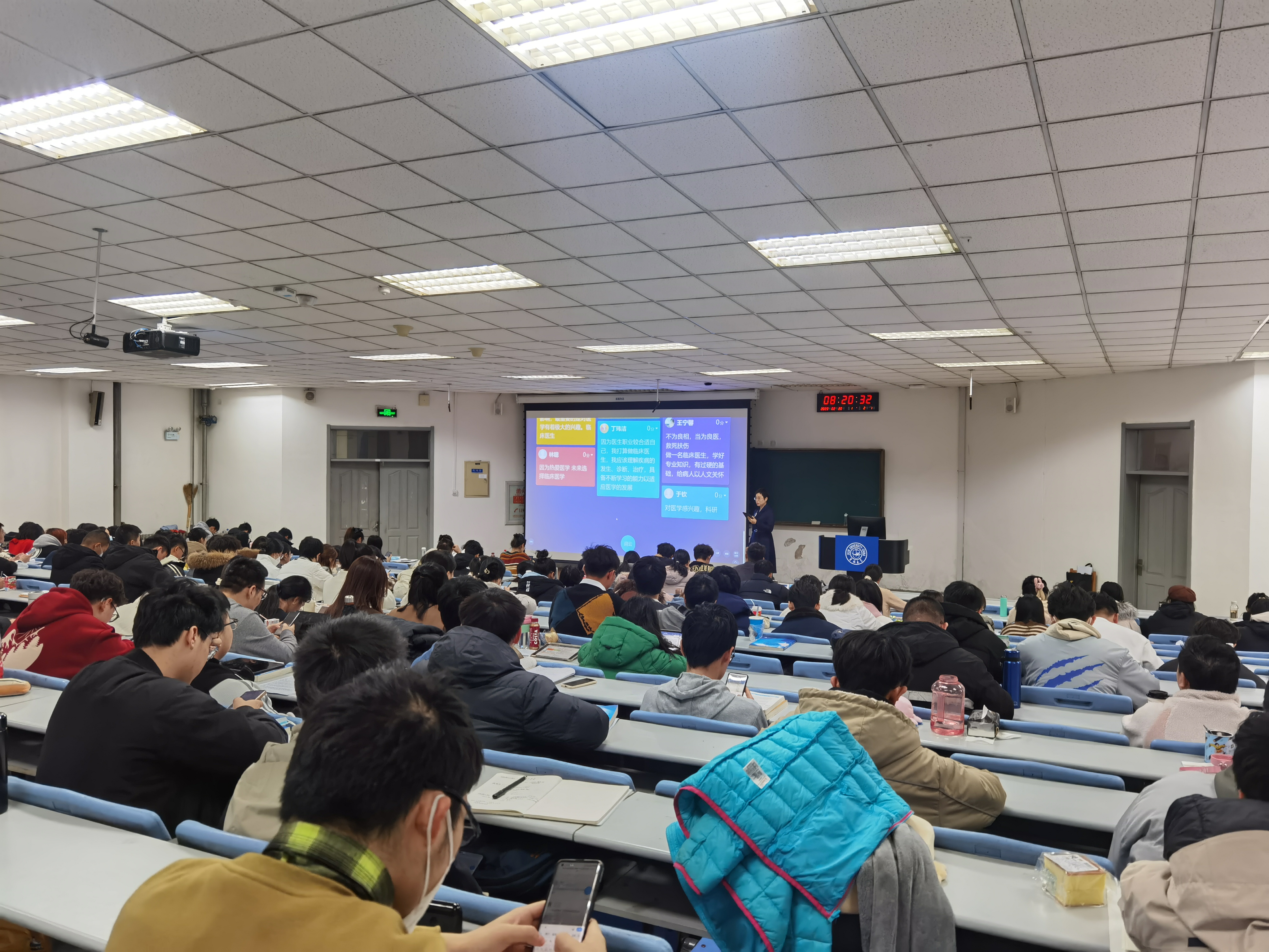 病理学系王医术教授利用线上线下融合式教学模式讲授《病理学》绪论第一课,任课教师情绪饱满,授课灵活生动,课堂气氛活跃,学生们精神状态良好,积极参与学习通主题讨论、抢答等活动。学院领导们与同学们一起认真听课,仔细记录,对任课教师的教学设计与内容、教学方法与手段、教学技能和教学效果给予了充分的肯定。