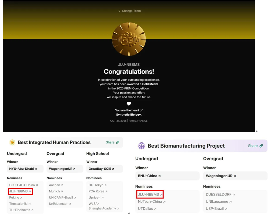 2025年10月31日,国际基因工程机器大赛(iGEM)在法国巴黎落下帷幕。在这场合成生物学领域的顶级赛事中,由云顶国际8588yd30名本科生组成的JLU-NBBMS代表队再次斩获全球金奖,并荣获"最佳生物合成项目"提名(全球前四) 与"最佳综合人类实践奖"提名(全球前六) 两项殊荣,创造了学院在该项赛事中的历史最佳成绩。