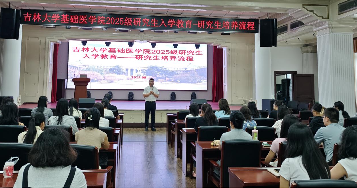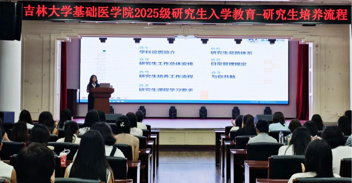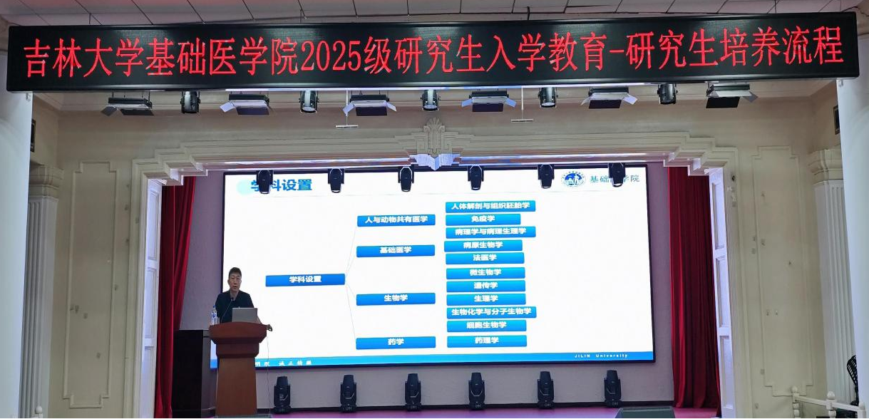 首先,院长王放教授对新生的到来表示热烈的欢迎。他围绕基础医学领域的发展历程与未来趋势展开分享,深入浅出地描绘了学科的前沿动态与广阔前景。同时,王院长向新生提出殷切期望,鼓励大家主动与导师沟通交流,结合个人兴趣与学科优势选定研究方向,扎实积累科研能力,养成求实严谨的科学态度和求真创新的学术精神,未来走向国际高水平科研平台,展现吉林大学学子的学术风采。