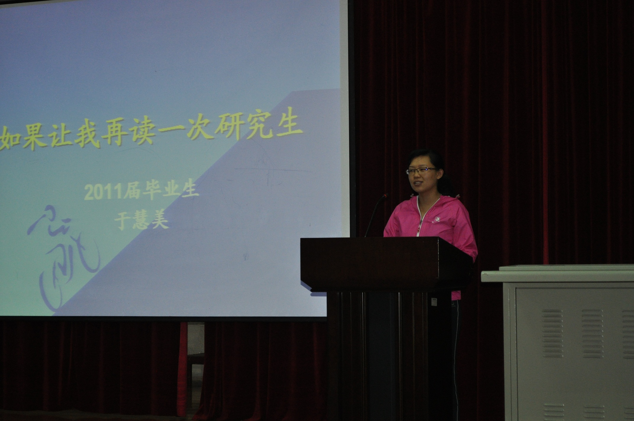 苏静以“如果当初我知道……”为题开始了她的经验报告。她首先以具体的事例告诉同学们,自信最重要,并且既要有目标又要有努力方向。在实际条件允许的情况下,目标尽量定高一些,给未来的自己做好规划,不能只做自己能力之下的事情,这样才能使自己的研究生生活过得充实而有意义。