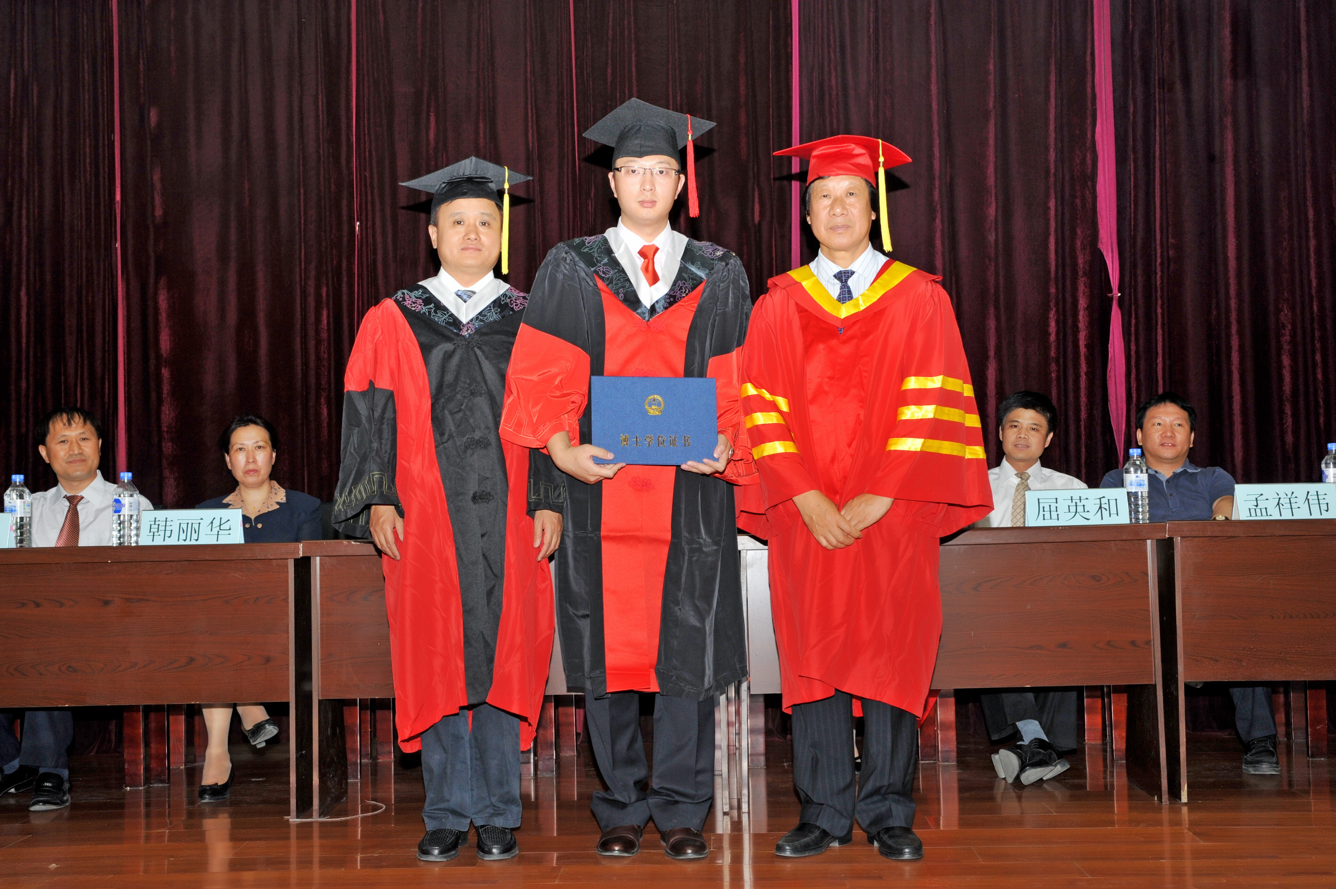 毕业典礼在庄严的国歌中开始,基础医学学位评定分委员会主席王丽颖宣读了获得学位的毕业生名单。伴随着欢快的进行曲,原吉林大学常务副校长、白求恩医学院院长李玉林和常务副院长孙连坤一起为学院62名硕士生、36名博士生一一授予学位、颁发学位证书并合影留念。学院党委书记屈英和宣读了《白求恩医学院关于表彰优秀博士学位论文获得者和优秀指导教师的决定》,各位领导为6名优秀博士论文获得者和5名优秀指导教师颁奖。