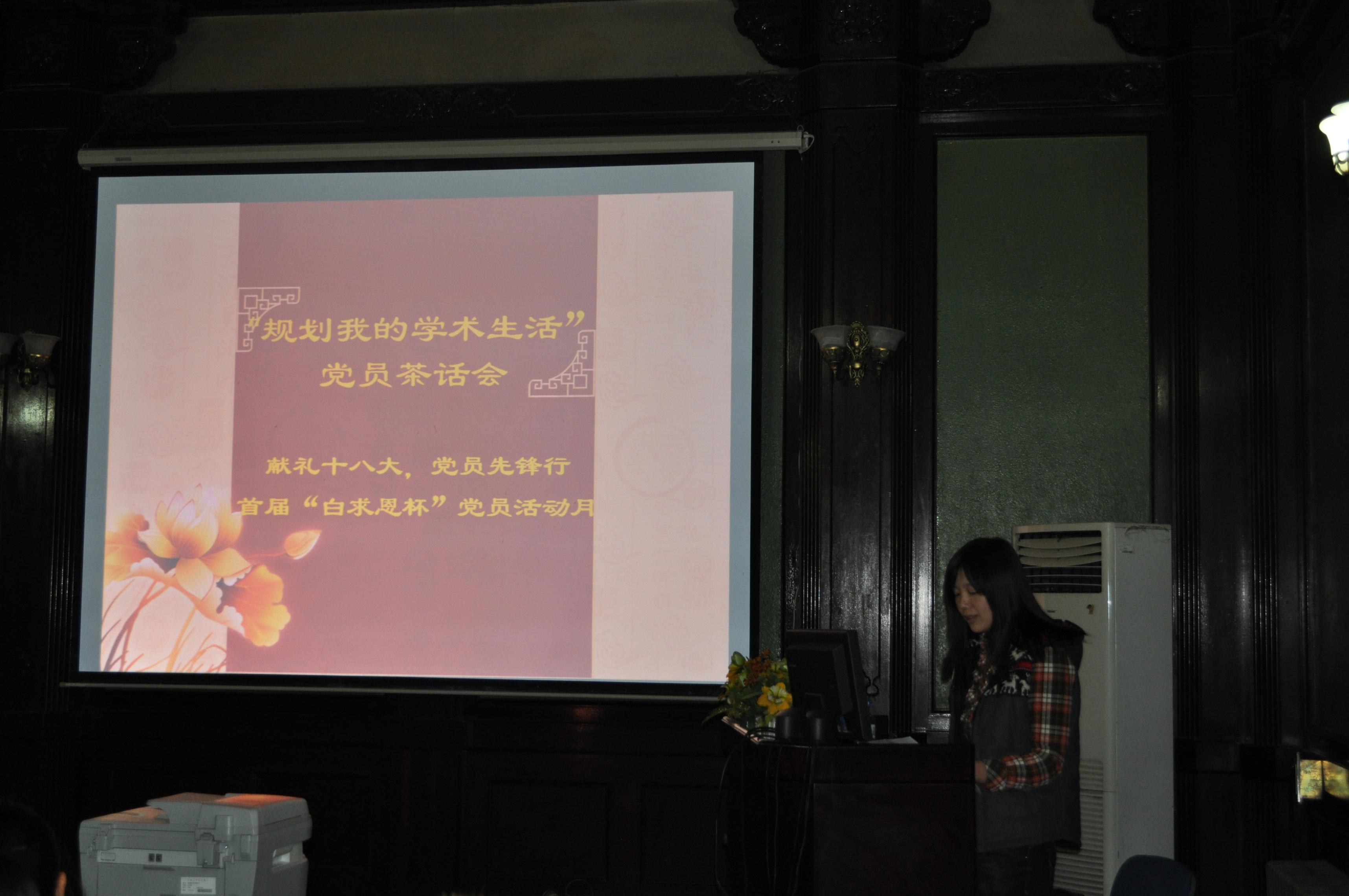 为迎接党的十八大的胜利召开,按照研究生党支部活力创新项目计划,11月16日下午,白求恩医学院2012级硕士、博士党支部主办的“献礼十八大,党员先锋行”之“规划我的学术生活”师生党员茶话会在基础楼四楼学术报告厅如期举行。会议邀请白求恩医学院青年教师发展委员会主任王国庆、秘书长孙巍、委员李丽莎和教师第二党支部书记王放为研究生传授学术经验。2012级硕士、博士党员及部分研究生参加了茶话会。2012级博士党支部书记石玥主持茶话会。