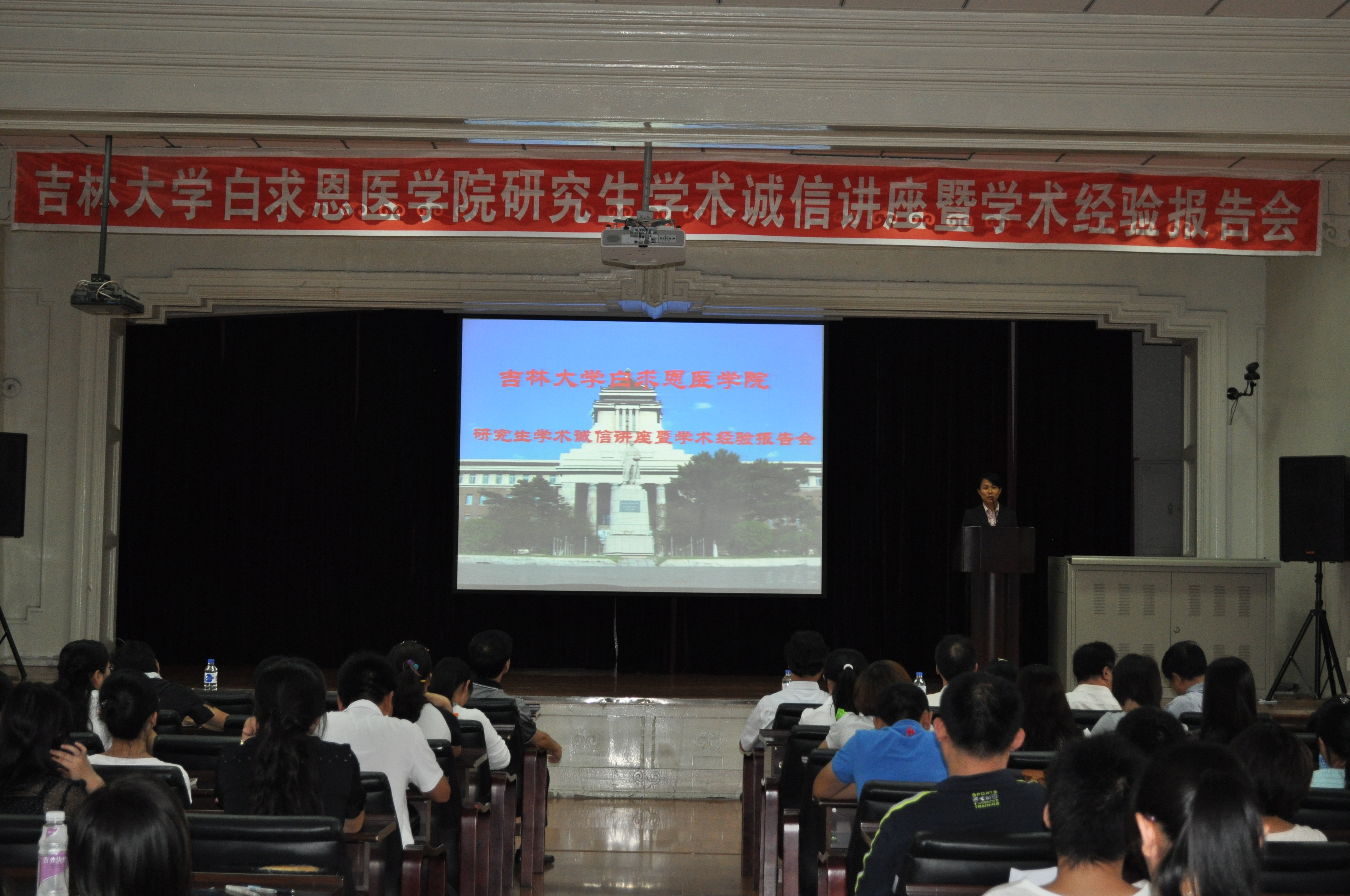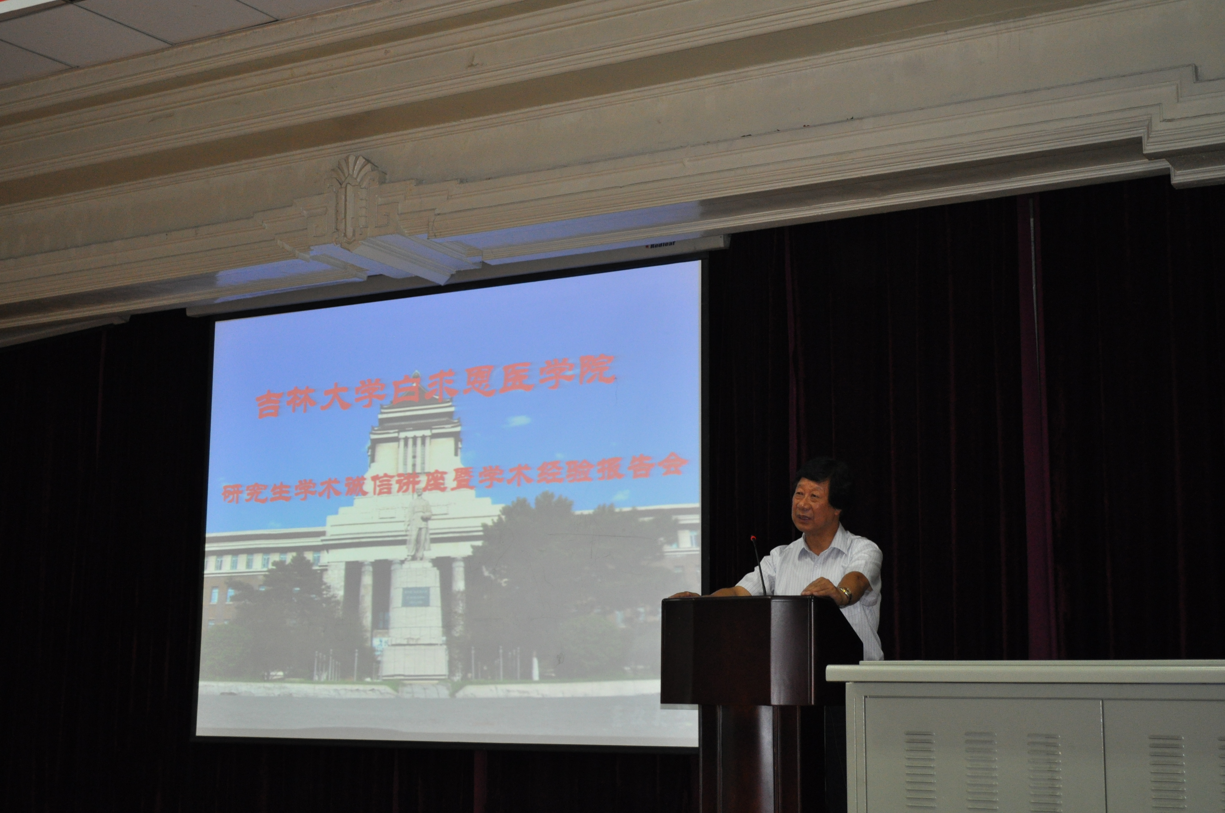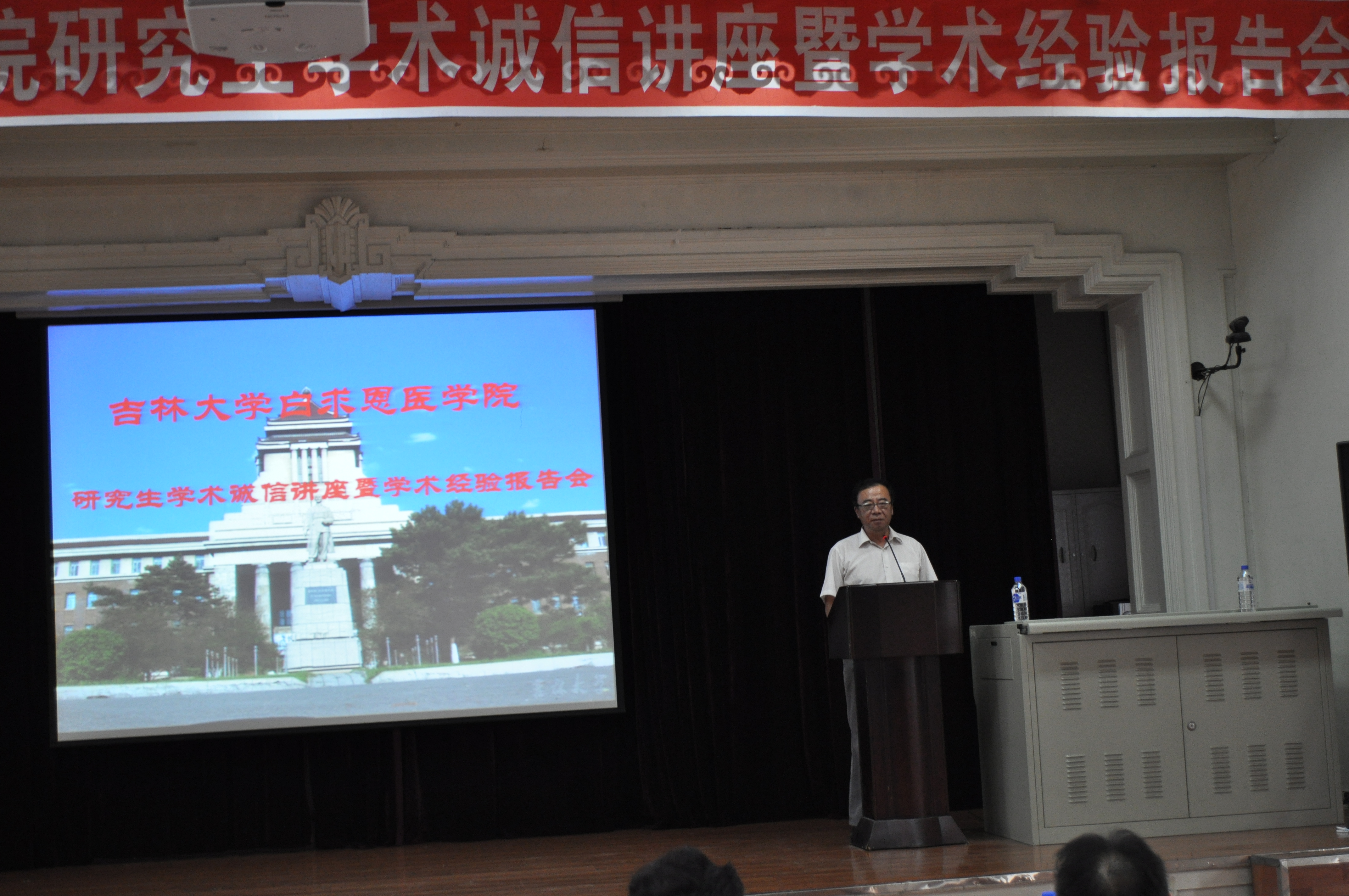 首先,原吉林大学常务副校长、白求恩医学院院长李玉林教授强调了学术诚信的重要意义,希望研究生从自身做起,多向导师和师兄师姐学习经验,坚定学术诚信,不能做违反职业道德的事情,以白求恩为榜样,精益求精做科研、做学问。随后,李桐忠老师通过详实的案例分析,阐述了学术不端行为产生的严重影响和不良后果,并重点强调了有关学术诚信的文件。希望广大研究生诚实做人,勤奋做事,成为国家的栋梁之才。之后,孙连坤教授从院领导和导师角度出发,语重心长的对广大研究生提出了严格的要求,并希望同学们认真钻研,认真积累,正确处理好理想与现实的关系,提高个人的综合素质,争取成为真正的研究型人才。最后,李一雷教授在严谨学术和严格训练,学会工作,规划人生三方面对广大研究生提出希望,并给予具体指导。